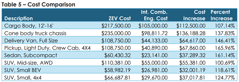 Also on Thursday April 9, CalTrans released a report shedding light for the first time on the hard costs of the ACF regulation. CalTrans owns over 12,000 vehicles. Its report details how the agency has spent state funds to begin converting its fleet to ZEV in an effort to comply with the CARB ACF regulations, highlighting the increased costs, delayed delivery times, and operational limitations of compliant vehicles. According to the report, “Electric vehicles are on average 132.82 percent more expensive than their equivalent internal combustion engine vehicle counterparts.” That’s more than twice the cost.