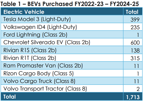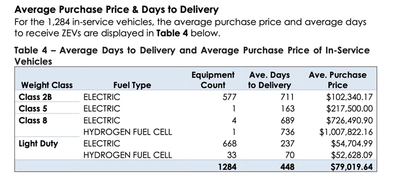 CalTrans purchased a limited number of vehicles above Class 2b, paying $217,500 for a Class 5 ZEV and an average of $726,490.90 for its four Class 8 electric vehicles, which took an average of 689 days to receive delivery of each ordered truck